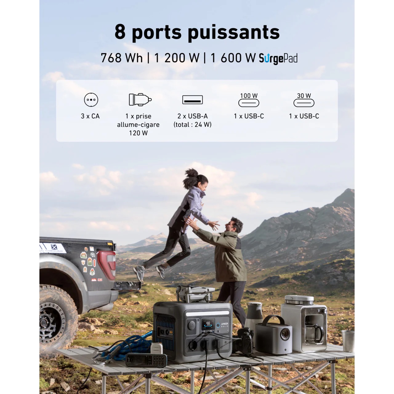 L’Anker SOLIX C800 est une station d’énergie portable robuste de 768 Wh, capable de fournir 1 200 W en sortie AC nominale (avec une pointe dite SurgePad à 1 600 W), recharge ultrarapide AC, entrée solaire jusqu’à 300 W, batterie LiFePO₄ à longue durée de vie, parfaite pour les aventures nomades, secours domestique ou usage extérieur.