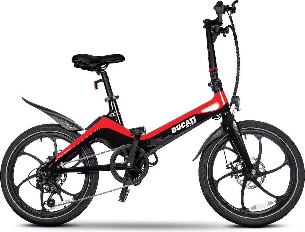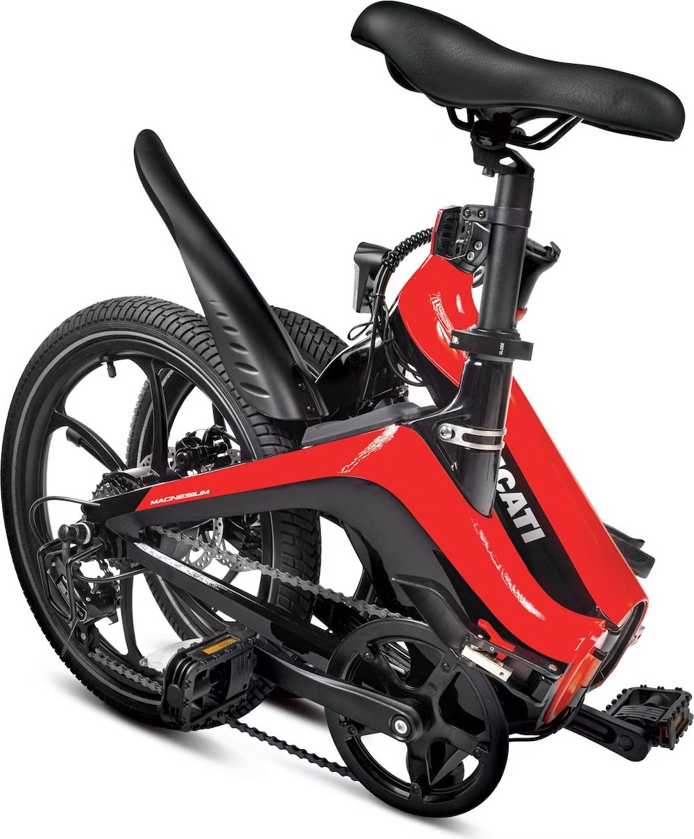 Le Ducati MG-20 est un vélo électrique pliant léger à la ligne élégante, doté d’un cadre en magnésium, d’un moteur de 250 W, d’une autonomie jusqu’à 50 km, et d’une utilisation ultra-urbaine et pratique.